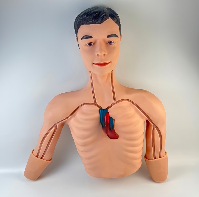 该模型带有透明的循环系统,血管结构逼真。颈内静脉、颈外静脉、锁骨下静脉、上腔静脉、颈动脉、头静脉、贵要静脉以及心脏大血管等,透明循环系统可清晰呈现导管进入上腔静脉的全过程。