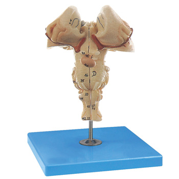 ■该模型由脑干矢状切面两部件组成,并显示脑干各个部分,包括中脑、脑桥、延髓以及间脑和脑神经等结构,共有67个部位指示标志。