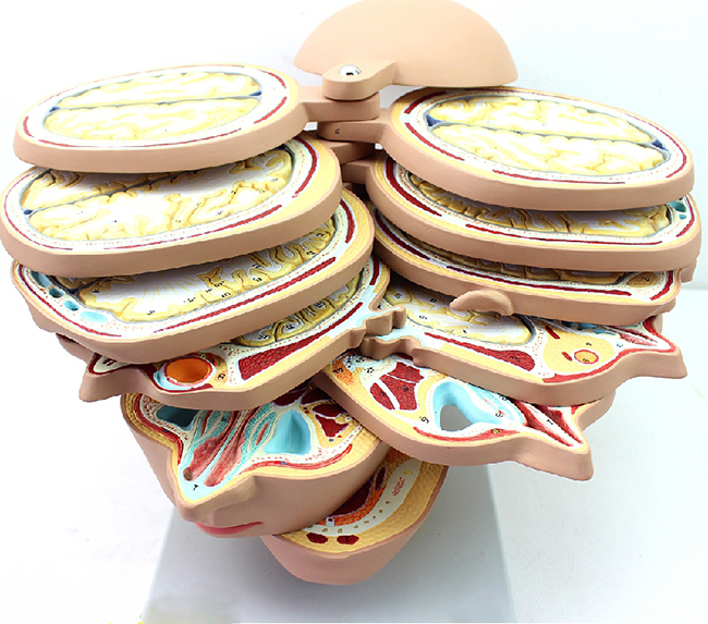 该模型以头颈部为主体进行水平断面设计,分为12片,10片厚度为10MM,每片可以单独取下,更好的方便使用者,特别的设计了数字标识,注解了每个关键点,使产品的实用性更强 精美手工绘制 环保PVC材质!