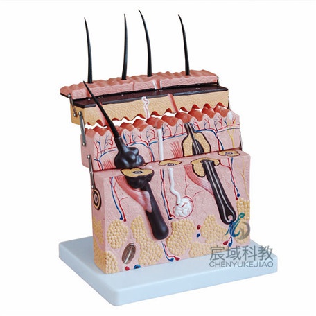 皮肤切面模型显示了皮肤的不同层次,用于学习头发、汗腺、皮肤感觉器官等基础知识。侧铰链连接,放于底座上。